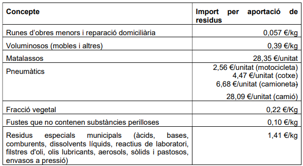 L’Ordenança fiscal 18 estableix una quota tributària pels excessos de quantitat de residus aportats a la deixalleria municipal per usuaris no particulars (comerços, oficines, tallers i petites indústries):