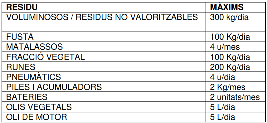 Per poder garantir un bon servei i atendre a tots els ciutadans, s’estableixen els següents límits per l’aportació de residus a la deixalleria: