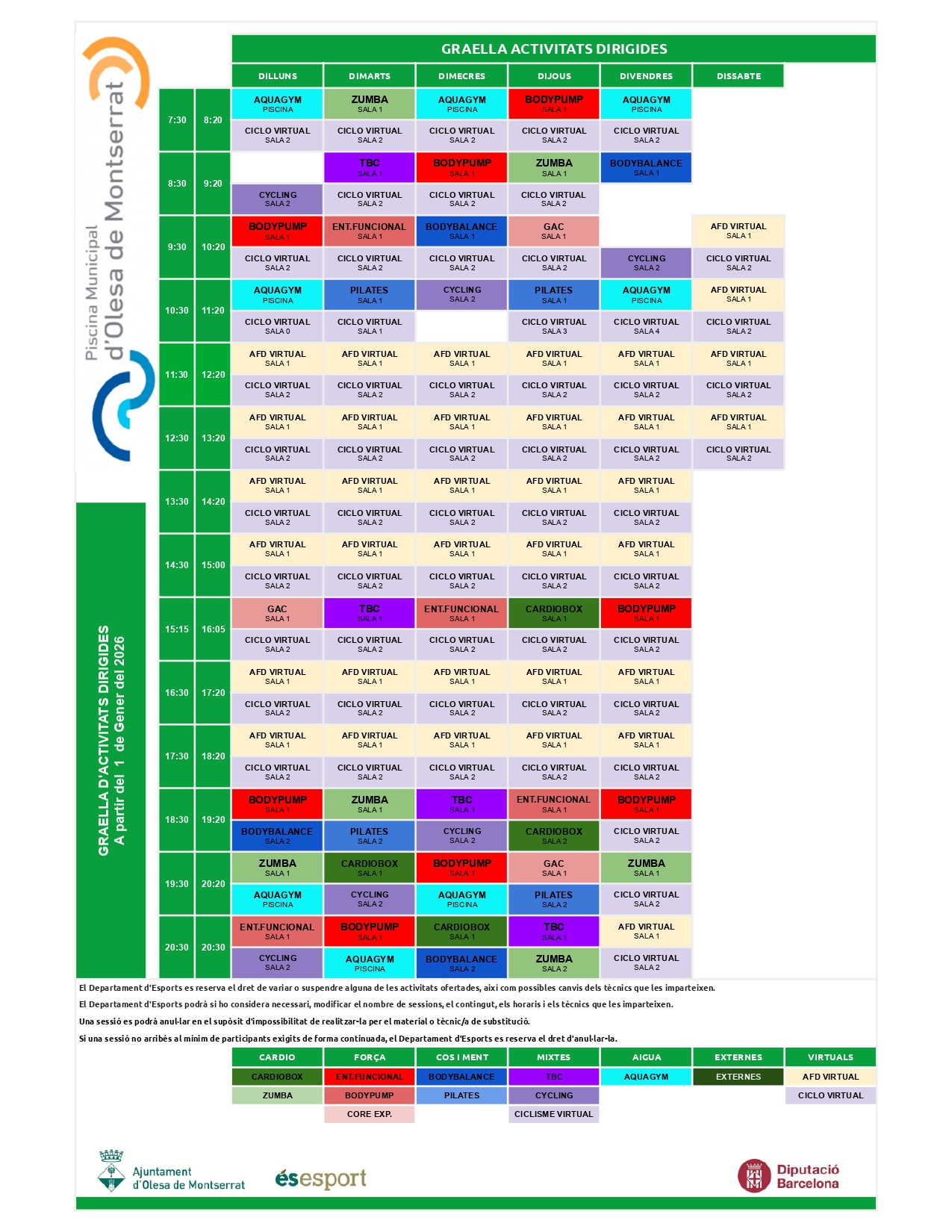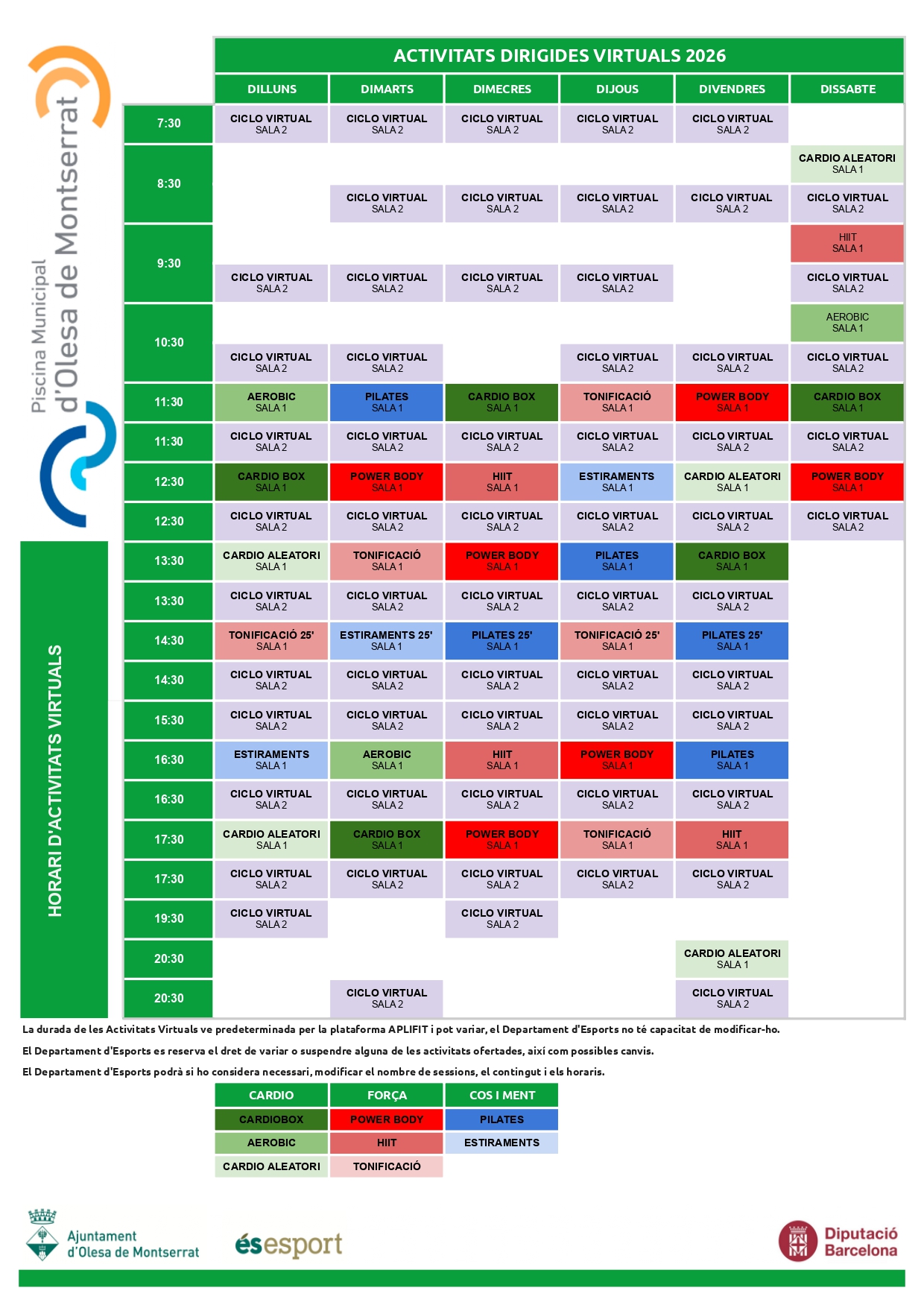 Horaris i activitats dirigides virtuals. A partir de l'1 de gener 2026